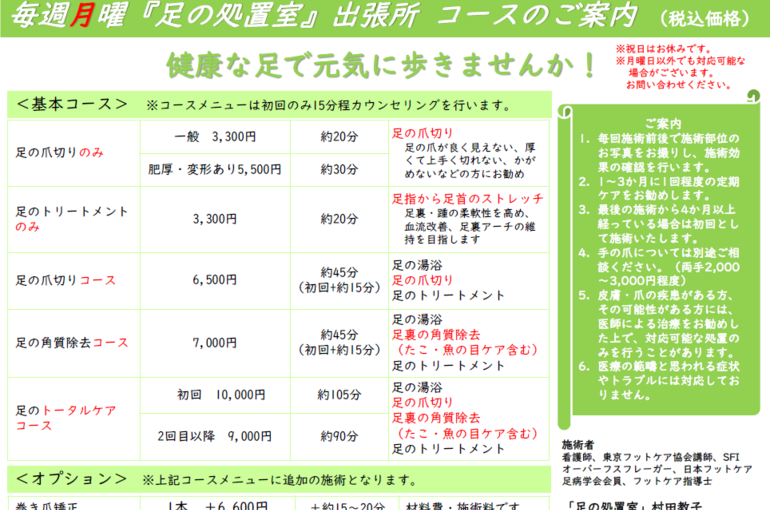 フットバス(足浴)・爪切り・トリートメント(マッサージ)のセットメニューの他、爪切りのみ・トリートメントのみのお手軽なメニューもあります。